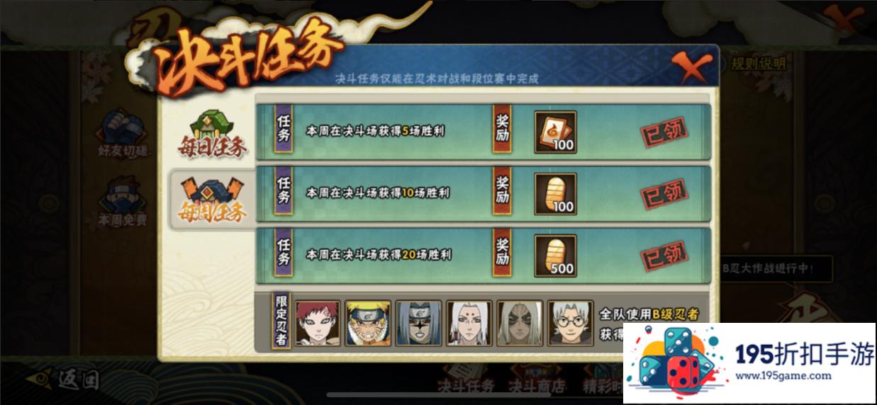 这个基本上算是一种错觉吧,有些人招募忍者的时候也会有这样的感觉,我就差一片或者一组了,老是卡住我,连续几次都不出,这种情况下只能说是脸白,对于脸白的玩家可能直接一发入魂了。再回到决斗场周胜任务,基本上都会刷“忍术对决”吧,这个模式下没有段位积分等限制,很多人喜欢用B忍或者C忍来快速刷20胜。